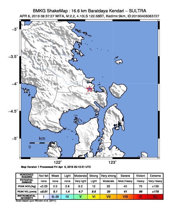 Badan Meteorologi, Klimatologi dan Geofisika (BMKG) Kendari menyebut, gempa bumi ini berkekuatan 2,2