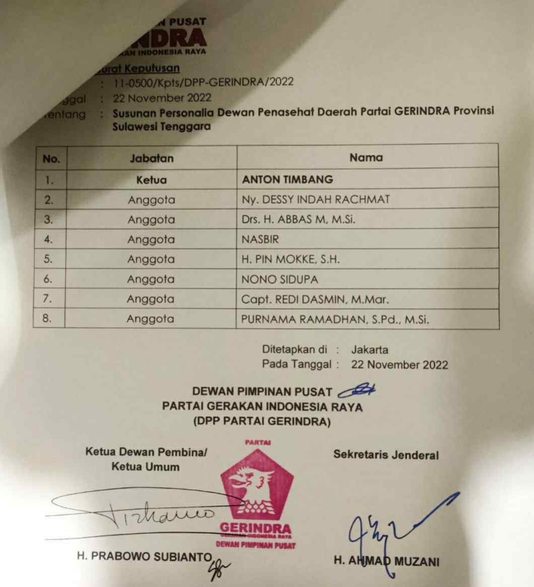 Dalam SK itu tertulis Anton Timbang menjadi Ketua Dewan Penasehat Daerah Partai Gerindra Provinsi Sulawesi Tenggara. Kemudian ada nama Dessy Indah Rachmat, Drs. H. Abbas M, Nasbir, H. Pin Mokke, Nono Sidupa, Capt. Redi Dasmin, dan Purnama Ramadhan sebagai anggota.