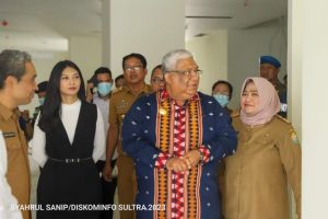 Gubernur Sultra Ali Mazi saat meninjau salah satu ruangan RS Jantung dan Pembuluh Darah Oputa Yi Koo yang masuk tahap finishing, Senin 20 Februari 2023.